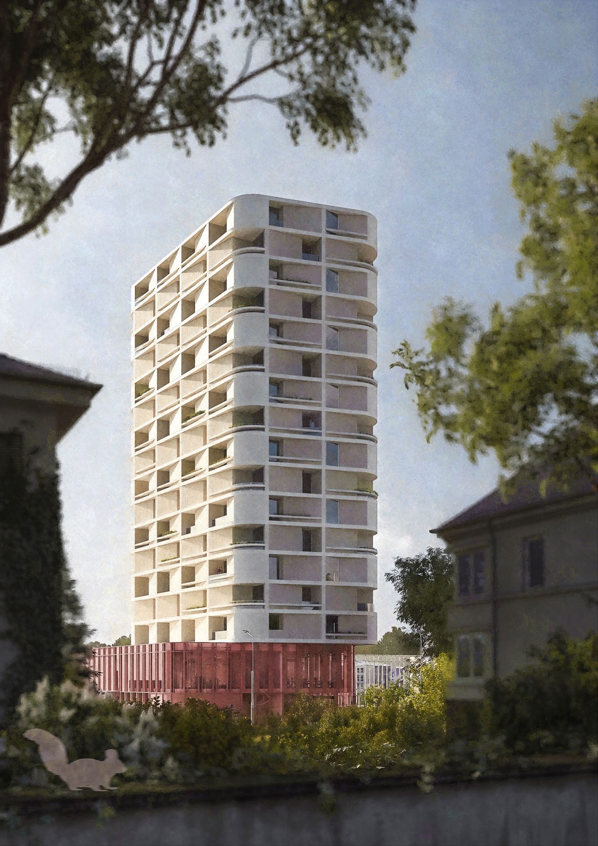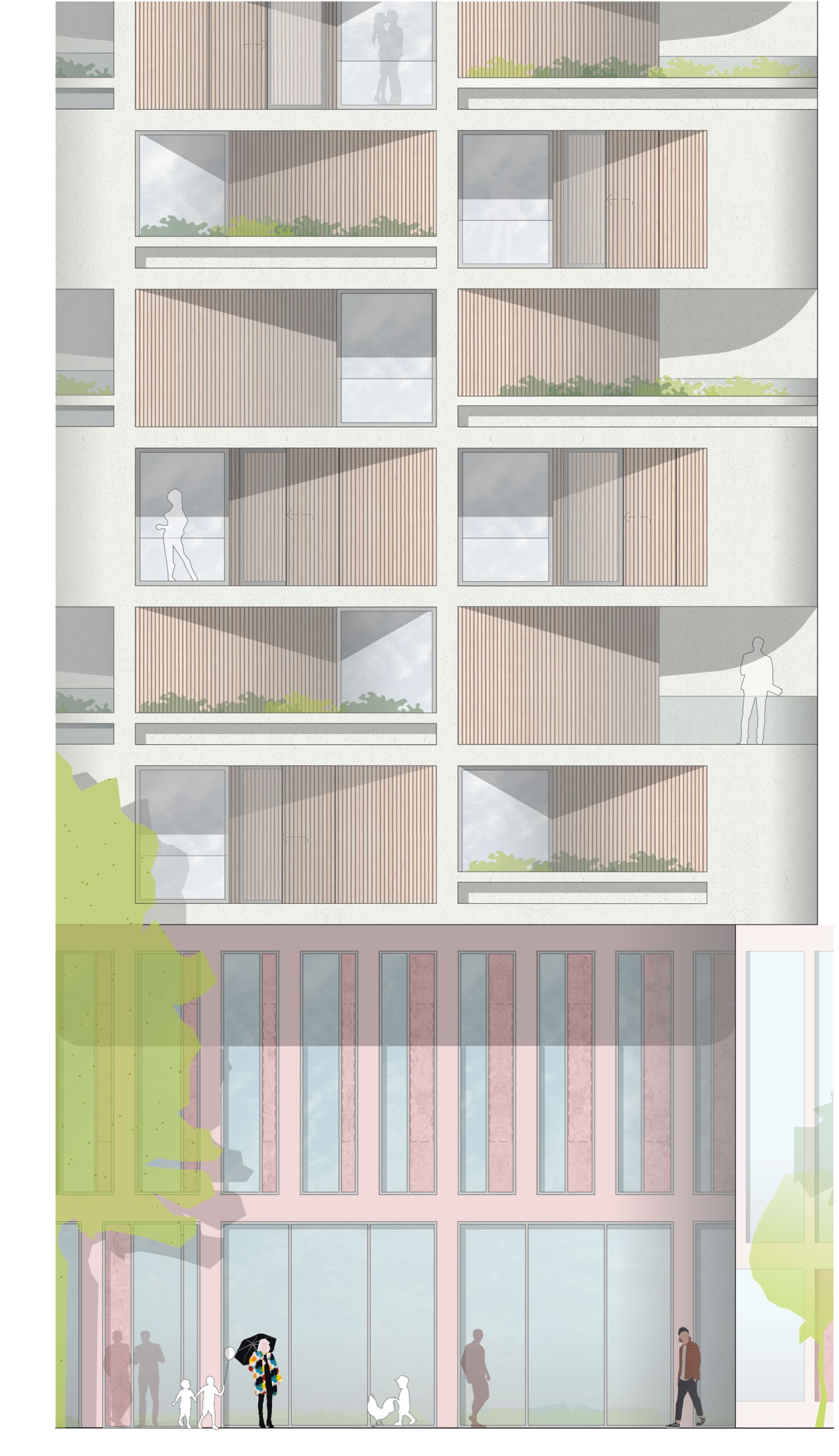 Insbesondere der weithin sichtbare, und städtebaulich prägende obere Bereich des Wohnturmes wird durch sein Wechselspiel aus Modularität und Systematik, aus Licht und schleifendem Schatten, aus einer differenzierten Ausformulierung von Öffnungen und paken Flächen, aus scharfen Kanten und weichen Rundungen, von hellen Wandflächen und begrünten Loggien einprägend sein. Die städtisch imposante Wirkung wird in einer differenzieren, maßstäblichen Matrix-Struktur ausformuliert. Der Sockel steht farblich sowie materialspezifisch in einem ruhigen Kontrast und verstärkt somit die strahlende Wirkung des oberen Bereiches. Somit spielt der Turm in seiner städtischen Wirkung mit dem Thema der geometrischen ortsspezifischen Relevanz und andererseits dem differenzierten, vielschichtigen menschlichen Maßstab.