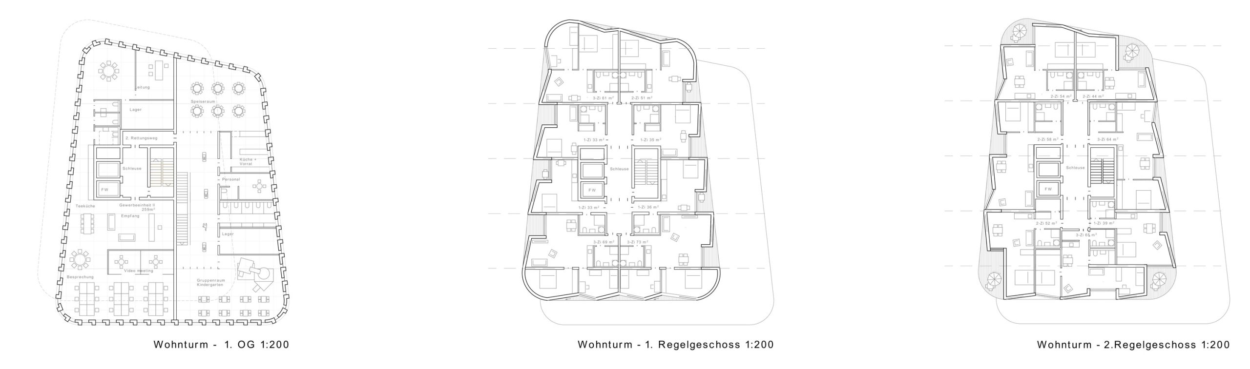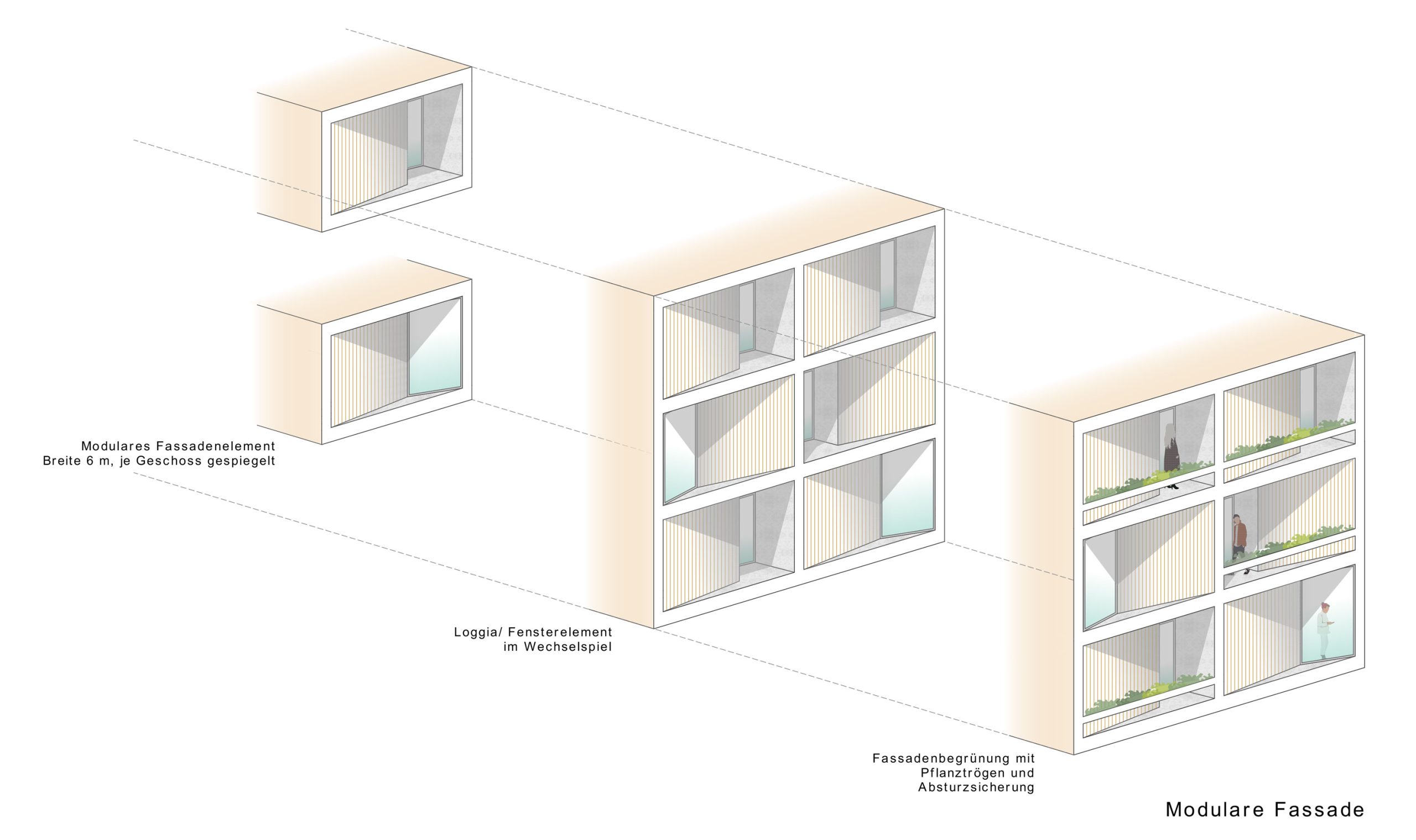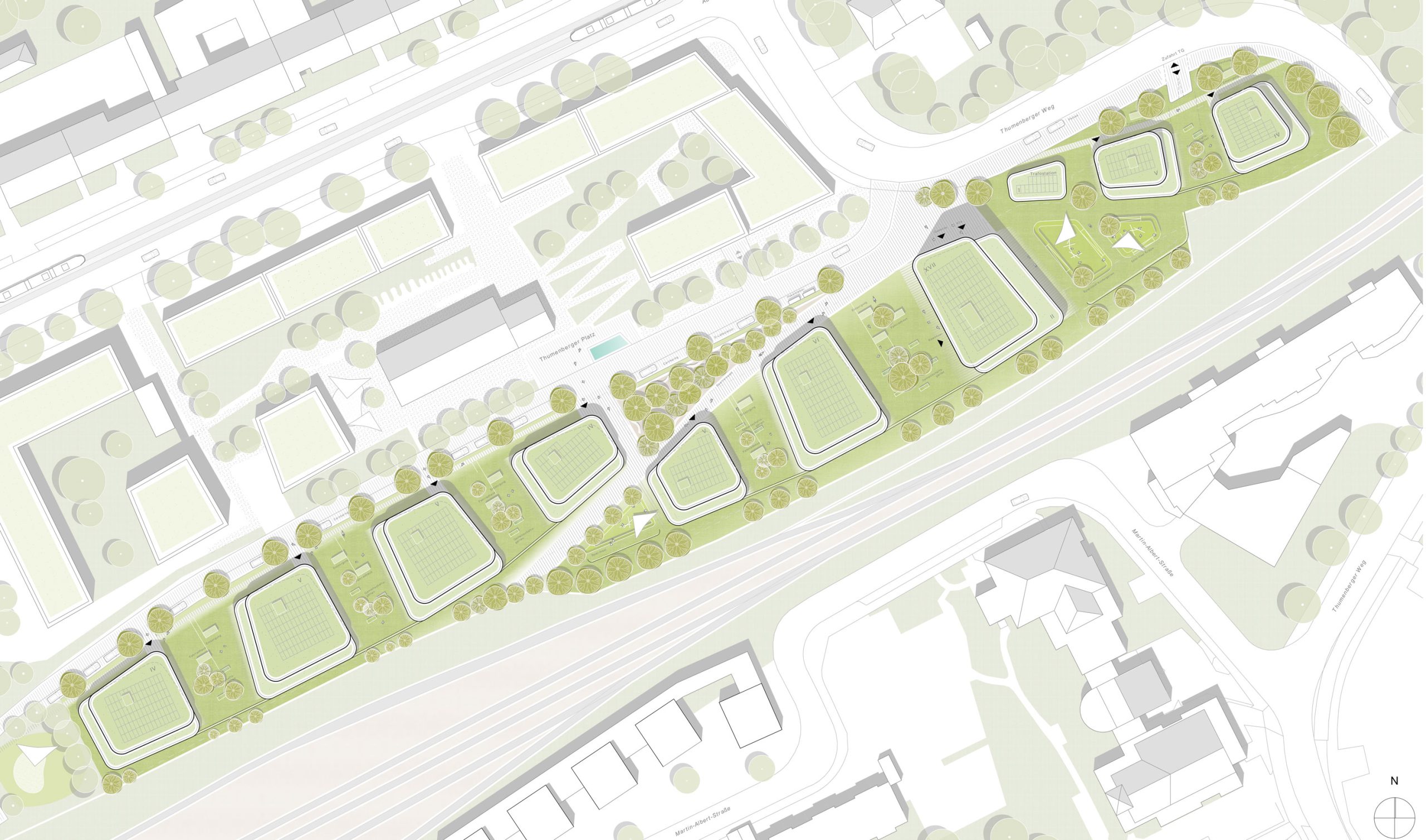Die Stadtbausteine und ebenso der Wohnturm werden im städtischen Maßstab insbesondere zu den Gleisen terrassiert zurückversetzt. Dies geht einher mit einem schallschützenden Zurückweichen und der qualitätsvollen Belichtungsmöglichkeit der Wohngeschosse. Die Eingänge der Baukörper werden dem Konzept der Verrundung folgend ebenso aus der Grundgestalt der Gebäude geschliffen, sodass im Stadtraum die Gebäude entsprechend verortet werden.